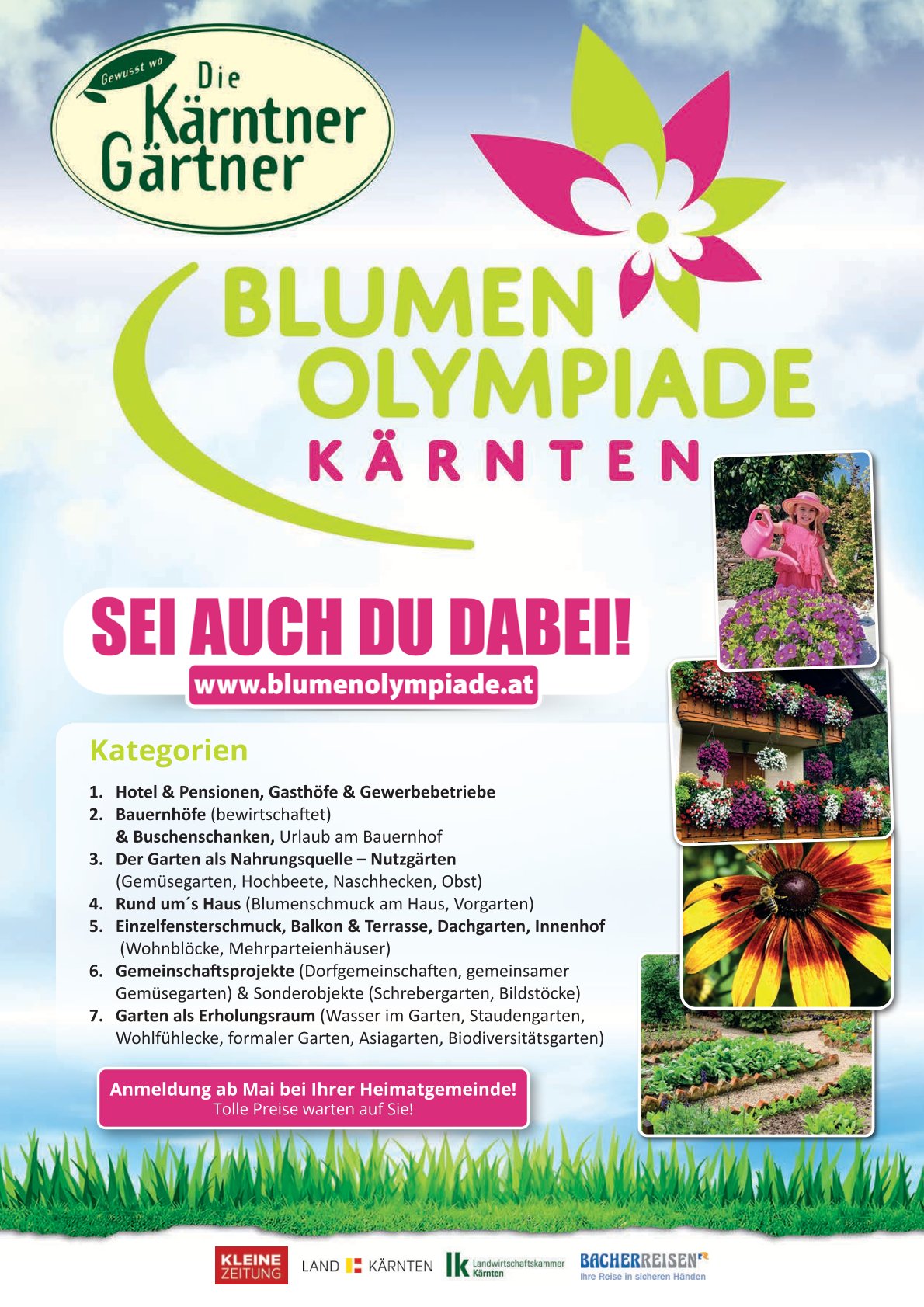 Zeig uns Deine Blumenpracht und mach mit bei der Kärntner Blumenolympiade. Egal ob Hobby- oder Nachwuchsgärtnerin, ob Hobby- oder Nachwuchsgärtner, ob Privatpersonen, Vereine oder Institutionen – alle können mitmachen. Anmeldungen sind auch in der Gemeinde Wernberg ab Mai möglich.