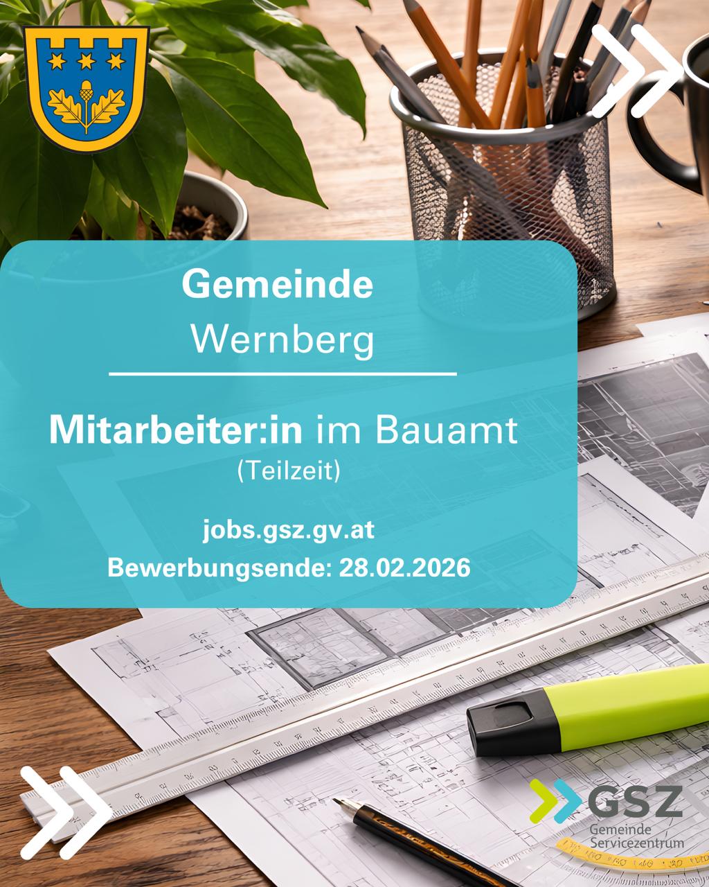 Die Gemeinde Wernberg gestaltet aktiv Ihre bauliche Zukunft. Ob private Bauwerber, Infrastrukturprojekte oder kommunale Gebäude – im Bauamt laufen viele Fäden zusammen. Zur Verstärkung unseres Teams suchen wir eine fachlich versierte Unterstützung, die Freude an abwechslungsreichen Aufgaben hat und Bauprojekte von der Planung bis zur Umsetzung begleitet.