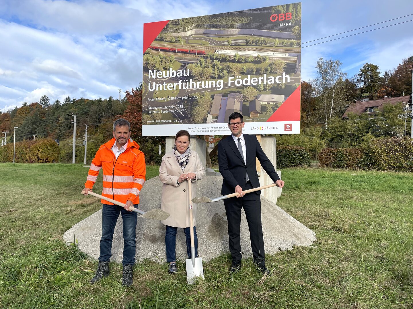 Den Spatenstich nahmen Bürgermeisterin Doris Liposchek, Landeshauptmann-Stellvertreter Martin Gruber und Franz Jank, Regionalleiter der ÖBB-Infrastruktur AG, gemeinsam vor. „Die Errichtung der neuen Bahnunterführung westlich des Bahnhofs in Föderlach ist für die Gemeinde Wernberg ein Jahrhundertprojekt“, betont Bürgermeisterin Liposchek.